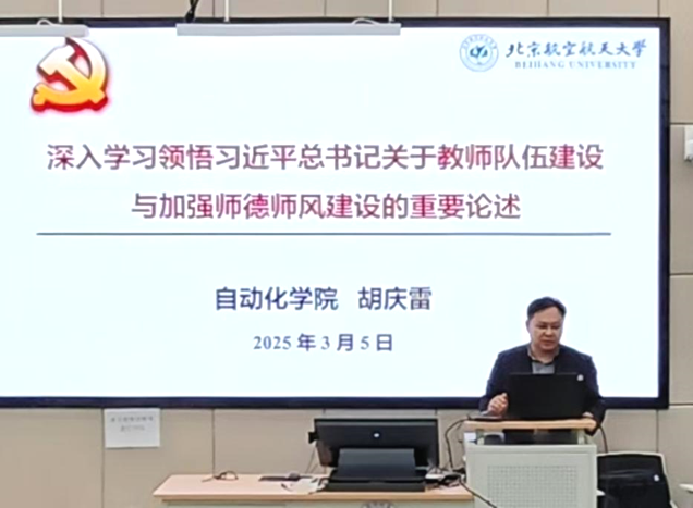 為深入學(xué)習(xí)貫徹黨的二十大和二十屆二中、三中全會精神,落實全國教育大會精神及立德樹人根本任務(wù),3月5日下午,自動化科學(xué)與電氣工程學(xué)院在學(xué)院路校區(qū)主201教室舉辦“深入學(xué)習(xí)領(lǐng)悟習(xí)近平總書記關(guān)于教師隊伍建設(shè)與加強師德師風(fēng)建設(shè)的重要論述”專題黨課,此次黨課由學(xué)院院長、黨委副書記胡慶雷主講。學(xué)院全體教職工參加了本次專題黨課學(xué)習(xí)。
